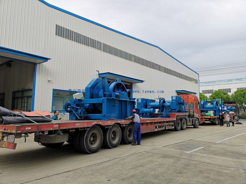 一条拖轮船全套甲板设备发往南通船厂,50T液压拖缆机,50T液压起锚机,15T液压绞系泊车,15T电动系泊起锚组合机,5T电动卧式绞盘